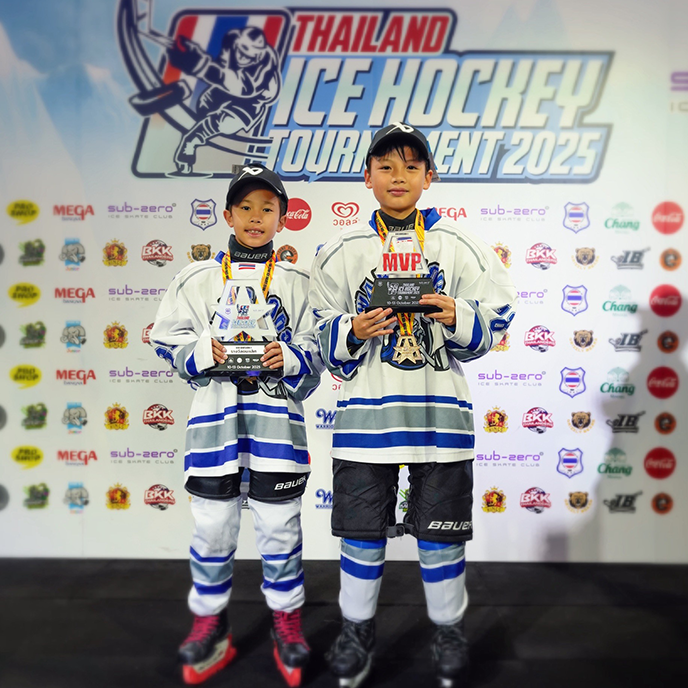 Both players were named MVPs of the Tournament at the Thailand Ice Hockey Tournament 2025, where their team - the Bangkok Warriors (U10 Division 1) - skated their way to Gold Victory!